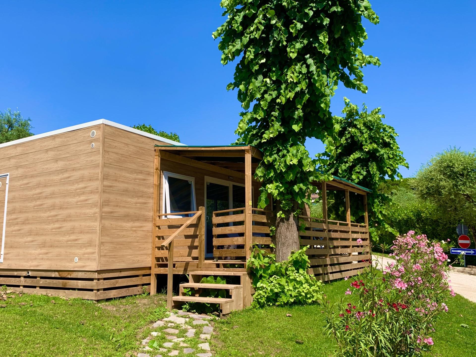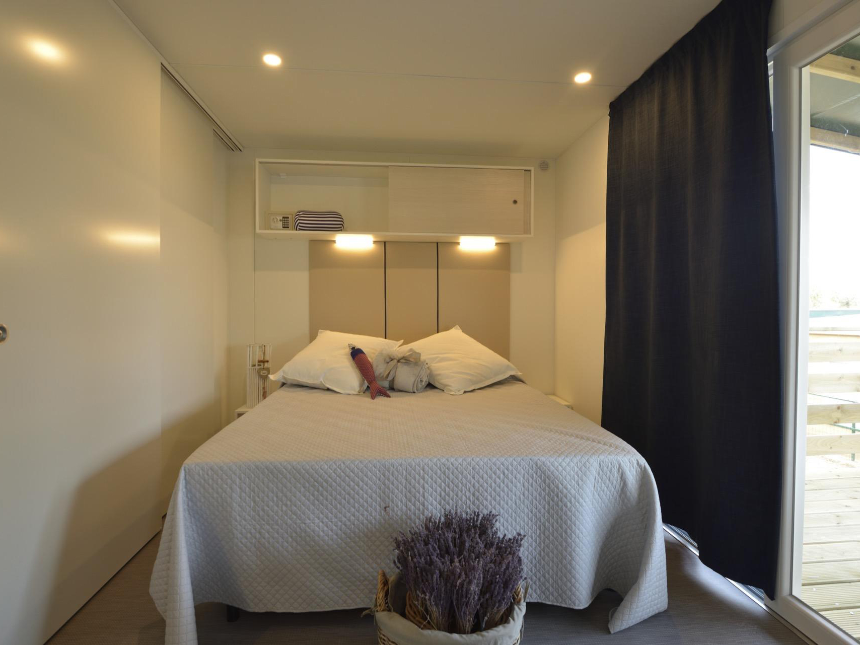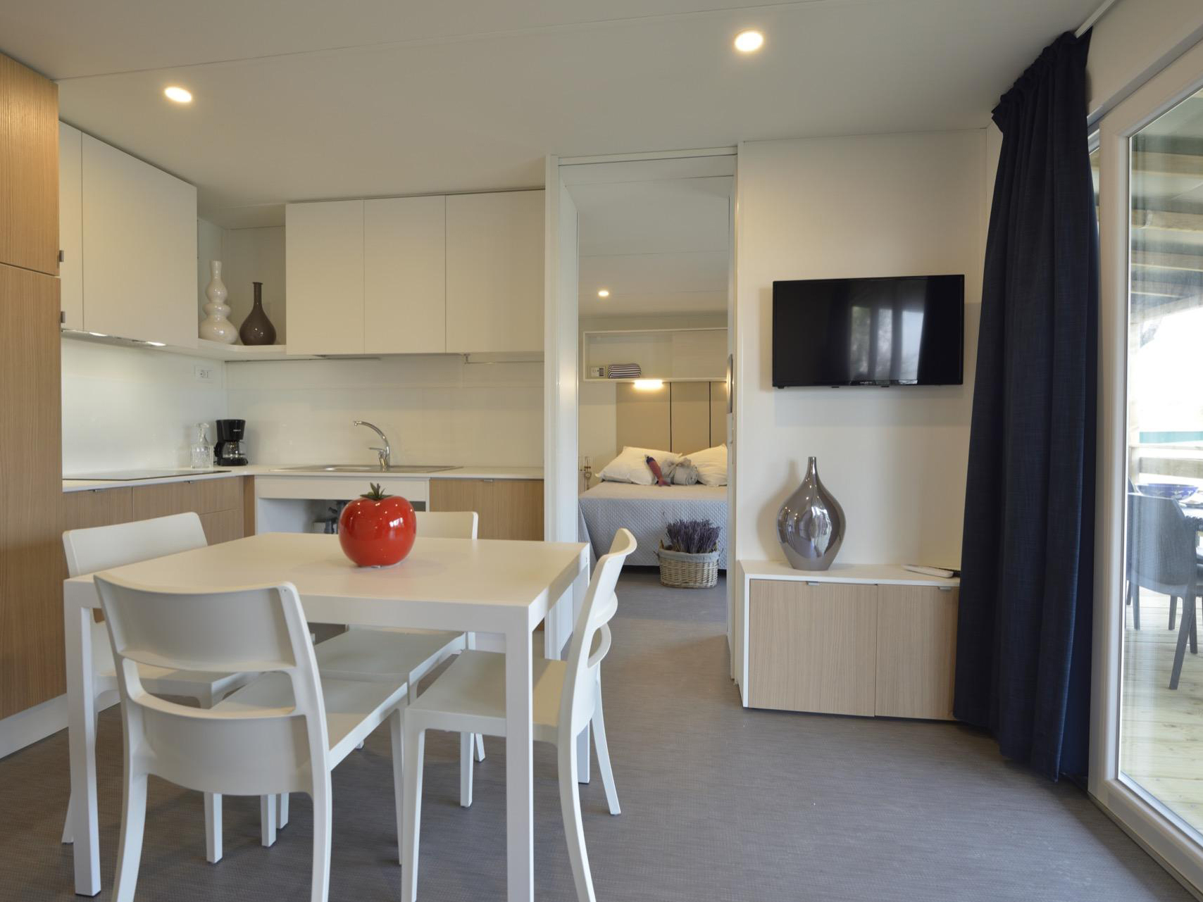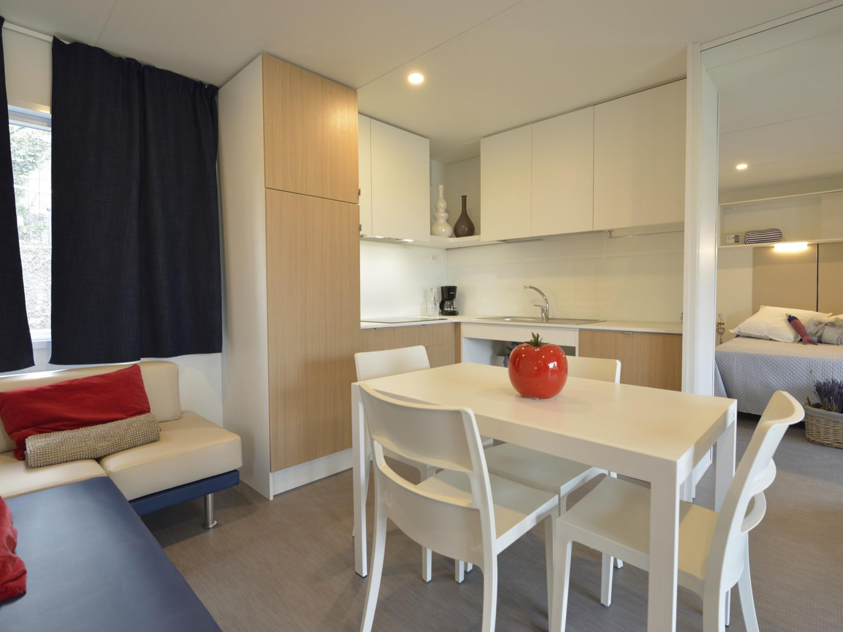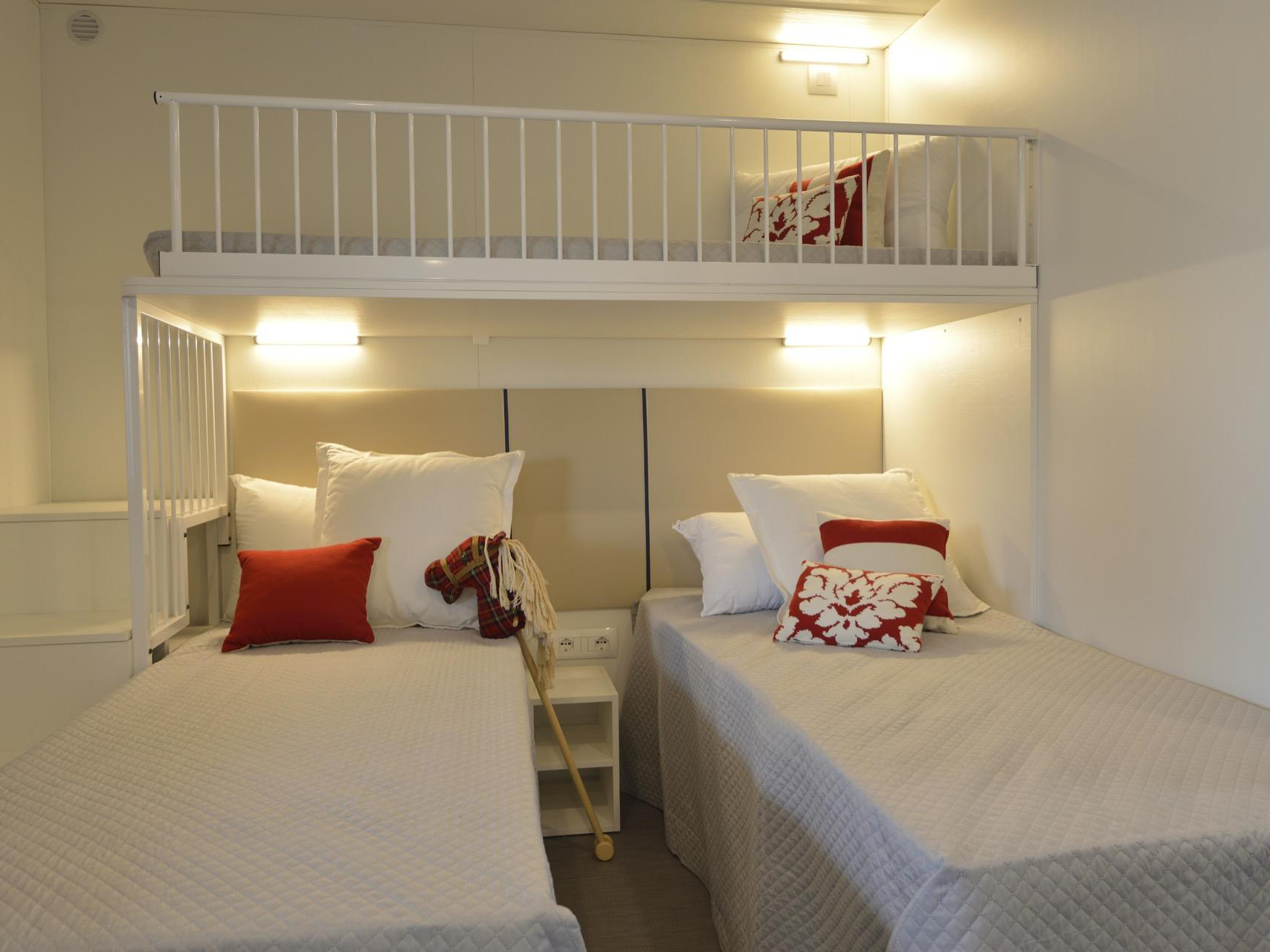 La casa mobile EXTRA LARGE può ospitare fino a 5 persone. La casa mobile, con una superficie di 44 mq, offre ampi spazi funzionali e confortevoli; la sistemazione dispone di soggiorno con aria condizionata, angolo cottura e divano, 1 camere da letto matrimoniale, 1 camera da letto con 3 letti singoli (di cui uno a soppalco) e 2 bagni con Wc, doccia e lavabo. All’esterno veranda coperta (8 x 2,5 m). La casa può ospitare 5 +1 persone, per la 6° persona (a pagamento) è disponibile un comodo letto pieghevole aggiuntivo. Un posto auto incluso. Animali NON ammessi.