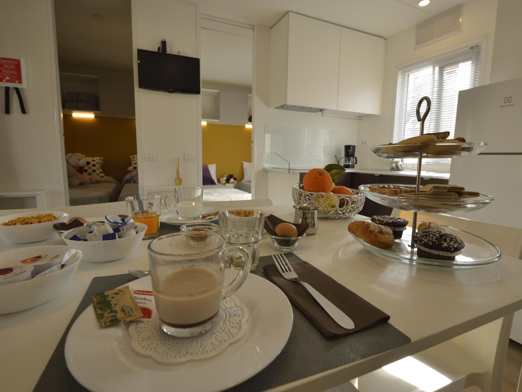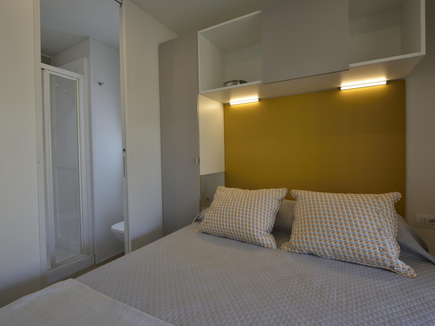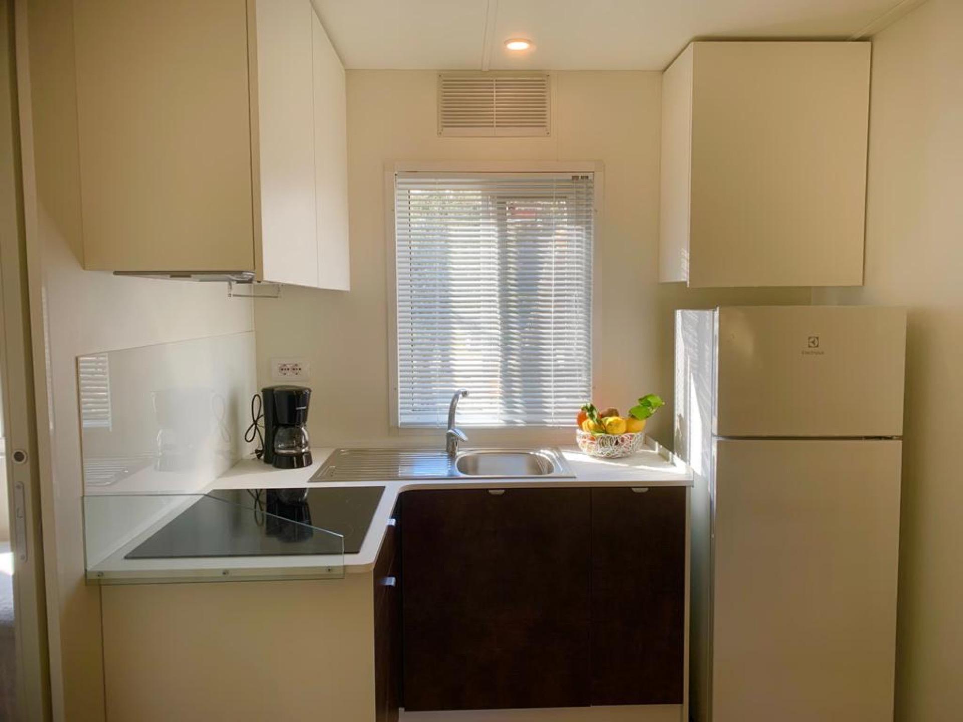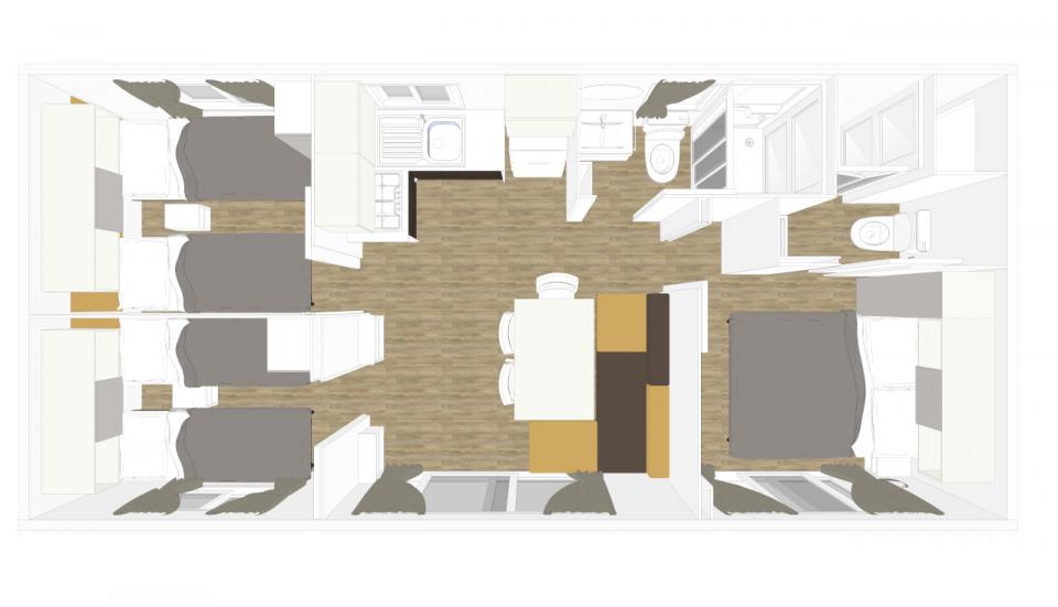 La casa mobile FAMILY può ospitare fino a 6 persone. La casa mobile, con una superficie di 30 mq, offre spazi funzionali e confortevoli; la sistemazione dispone di soggiorno con aria condizionata, angolo cottura con induzione e divano, 1 camere da letto matrimoniale, 2 camera da letto ciascuna con 2 letti singoli e 2 bagni con Wc, doccia e lavabo. All’esterno veranda coperta (8 x 2,5 m). Un posto auto incluso. Animali NON ammessi.