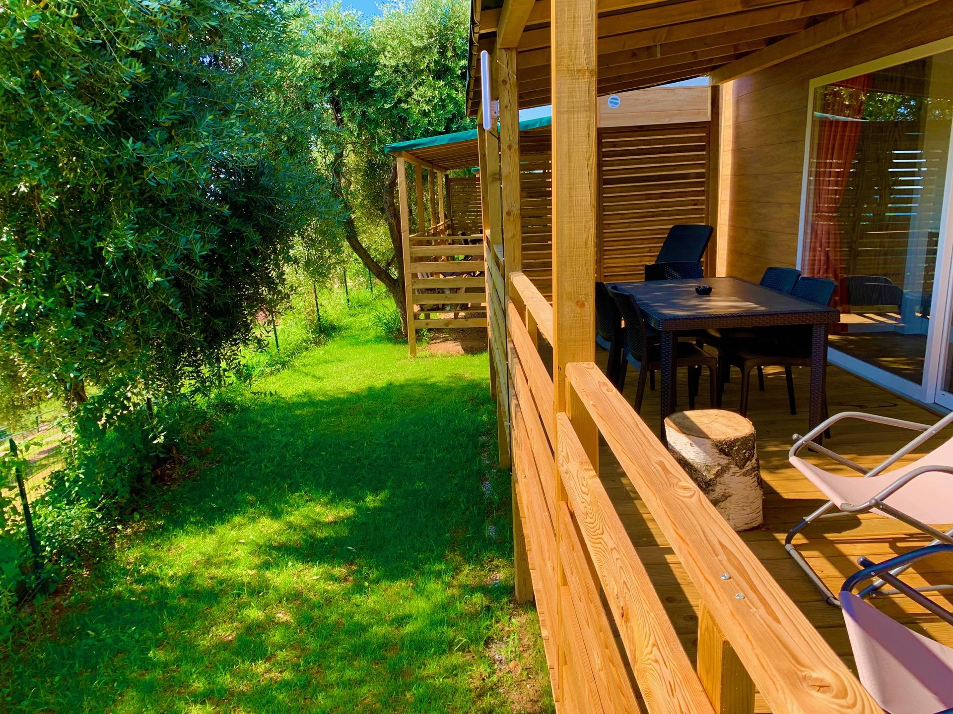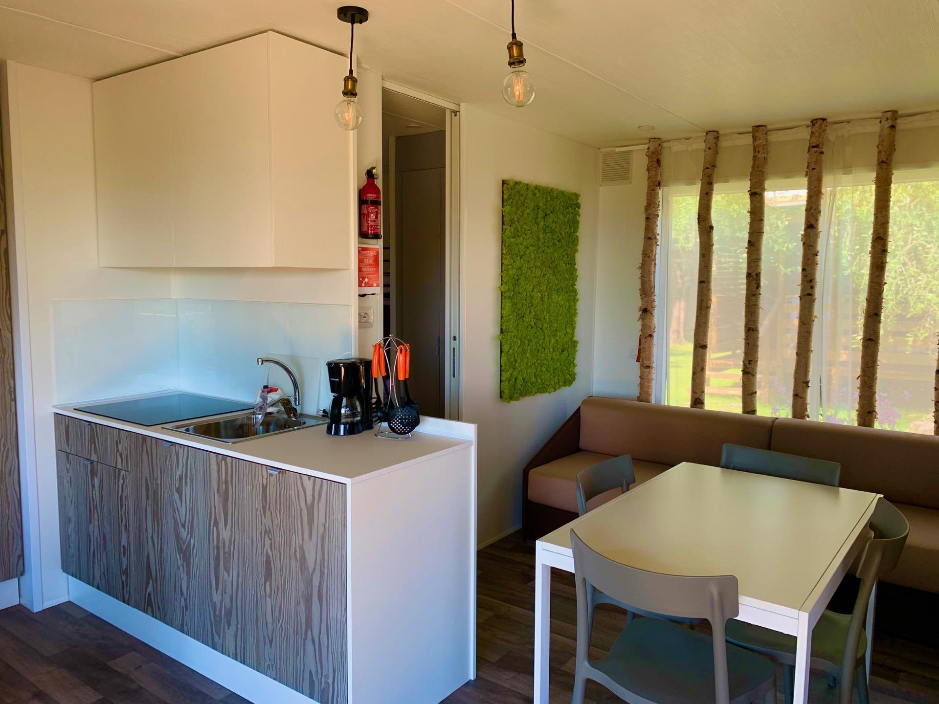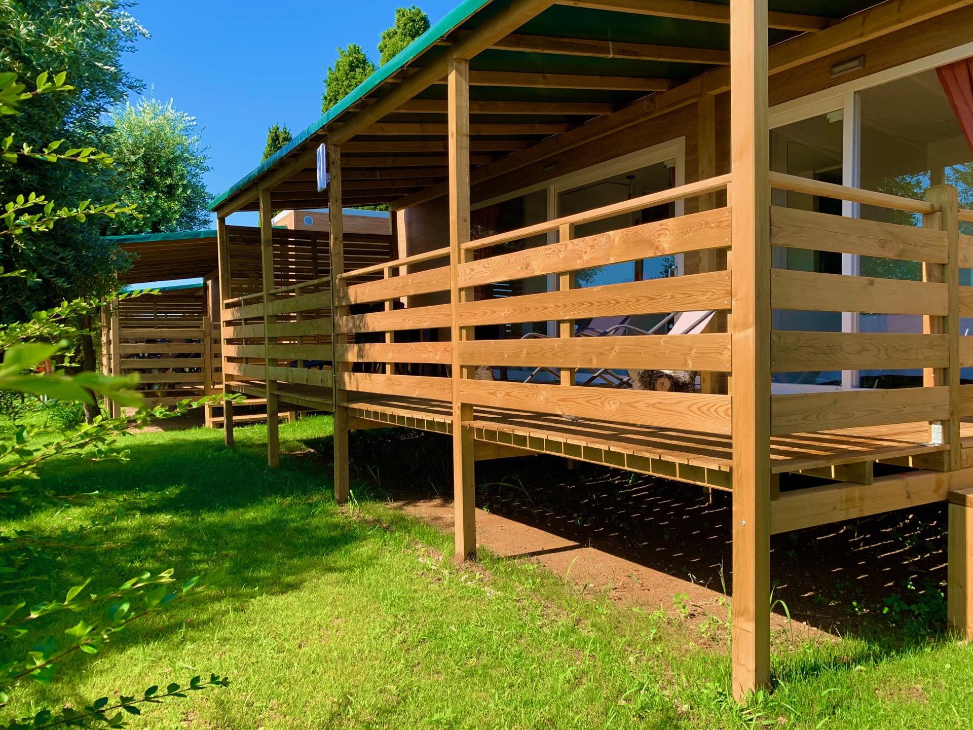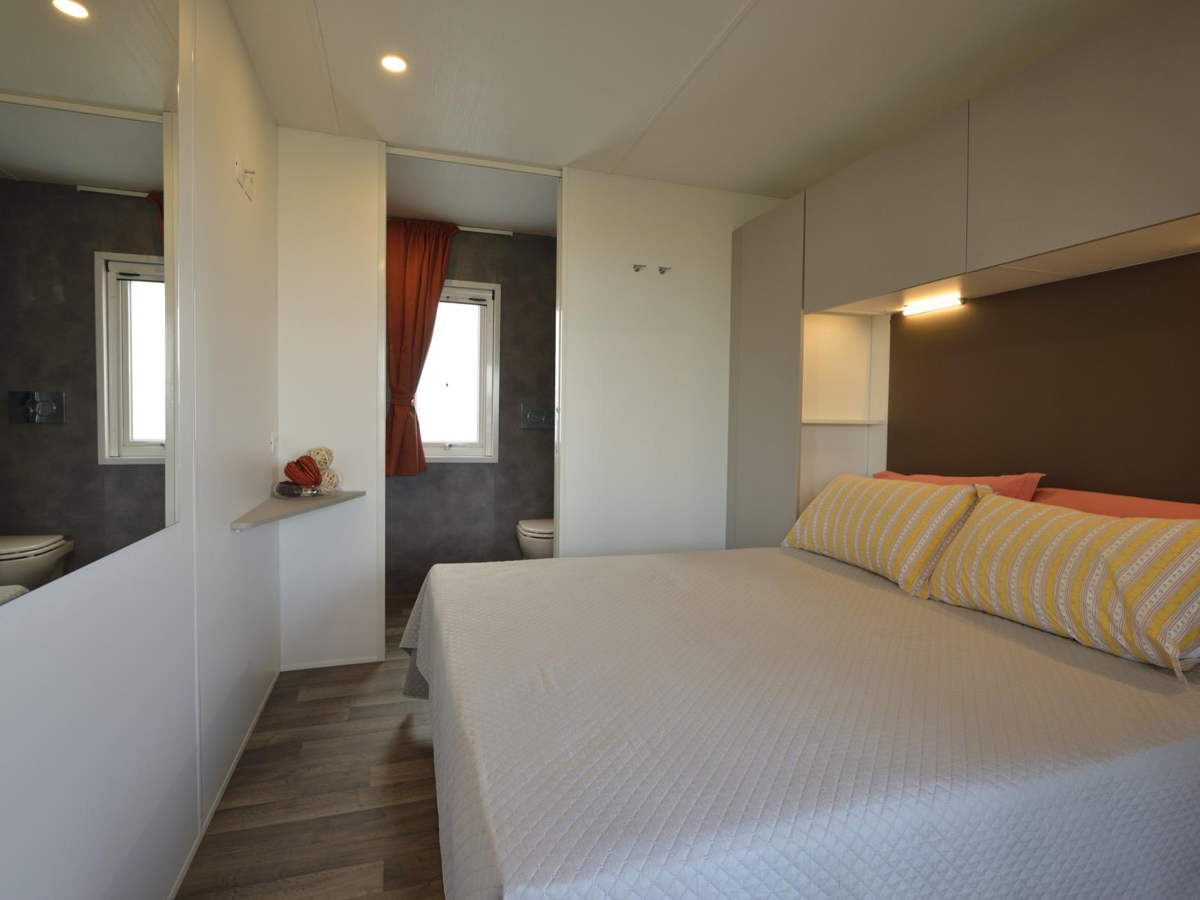 La casa mobile TOP HILL può ospitare fino a 5 persone. La casa mobile, con una superficie di 37 mq, offre spazi funzionali e confortevoli; la sistemazione dispone di soggiorno con aria condizionata, angolo cottura e divano, 1 camere da letto matrimoniale, 1 camera da letto con 3 letti singoli (di cui uno a bandiera) e 2 bagni con Wc, doccia e lavabo. All’esterno veranda coperta (8 x 2,5 m). Un posto auto incluso. Animali NON ammessi.