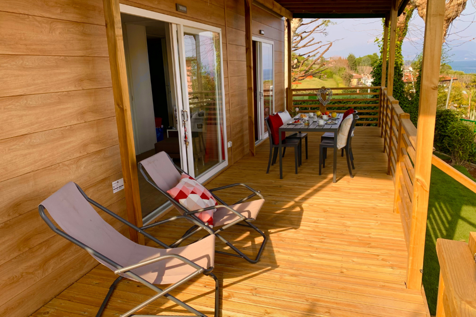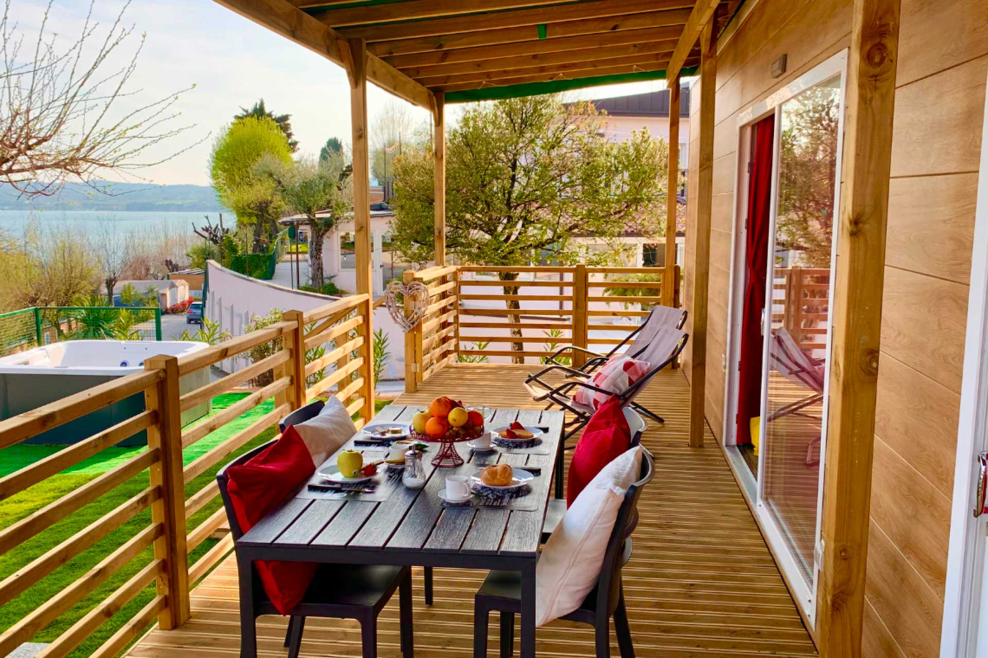 La nuovissima Villa con VISTA LAGO e vasca idromassaggio (44 m²) è la casa mobile adatta per chi desidera soggiornare in spazi ampi, eleganti e ben organizzati, godendo di una splendida vista lago direttamente dalla veranda di casa. In giardino si trova la vasca idromassaggio privata che permette di godere momenti di totale relax. Dispone di un grande soggiorno con aria condizionata, angolo cottura con piano ad induzione e lavastoviglie, divano, 1 grande camera da letto matrimoniale con aria condizionata, 1 camera da letto con 2 letti a castello, 2 bagni con Wc, doccia e lavabo. La casa può ospitare 6 persone. Nel grande giardino della Villa spa Lake view ci sono vasca idromassaggio e BBQ ad uso esclusivo. Un posto auto incluso. Animali NON ammessi.