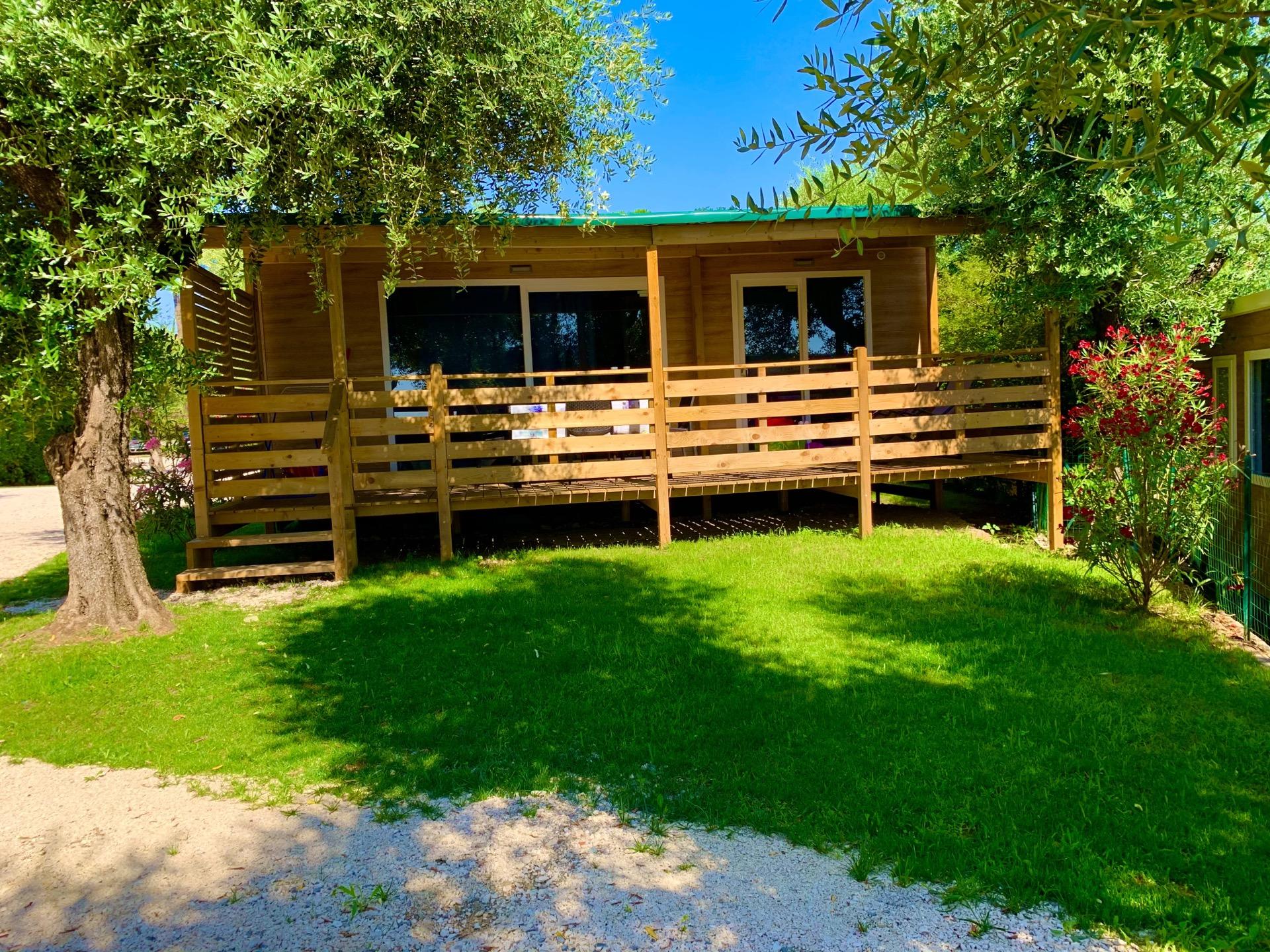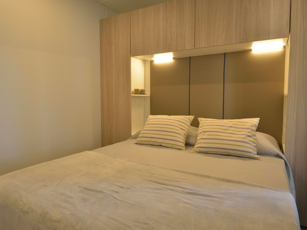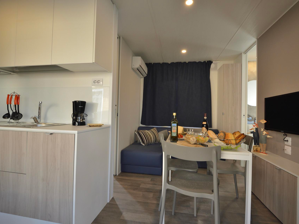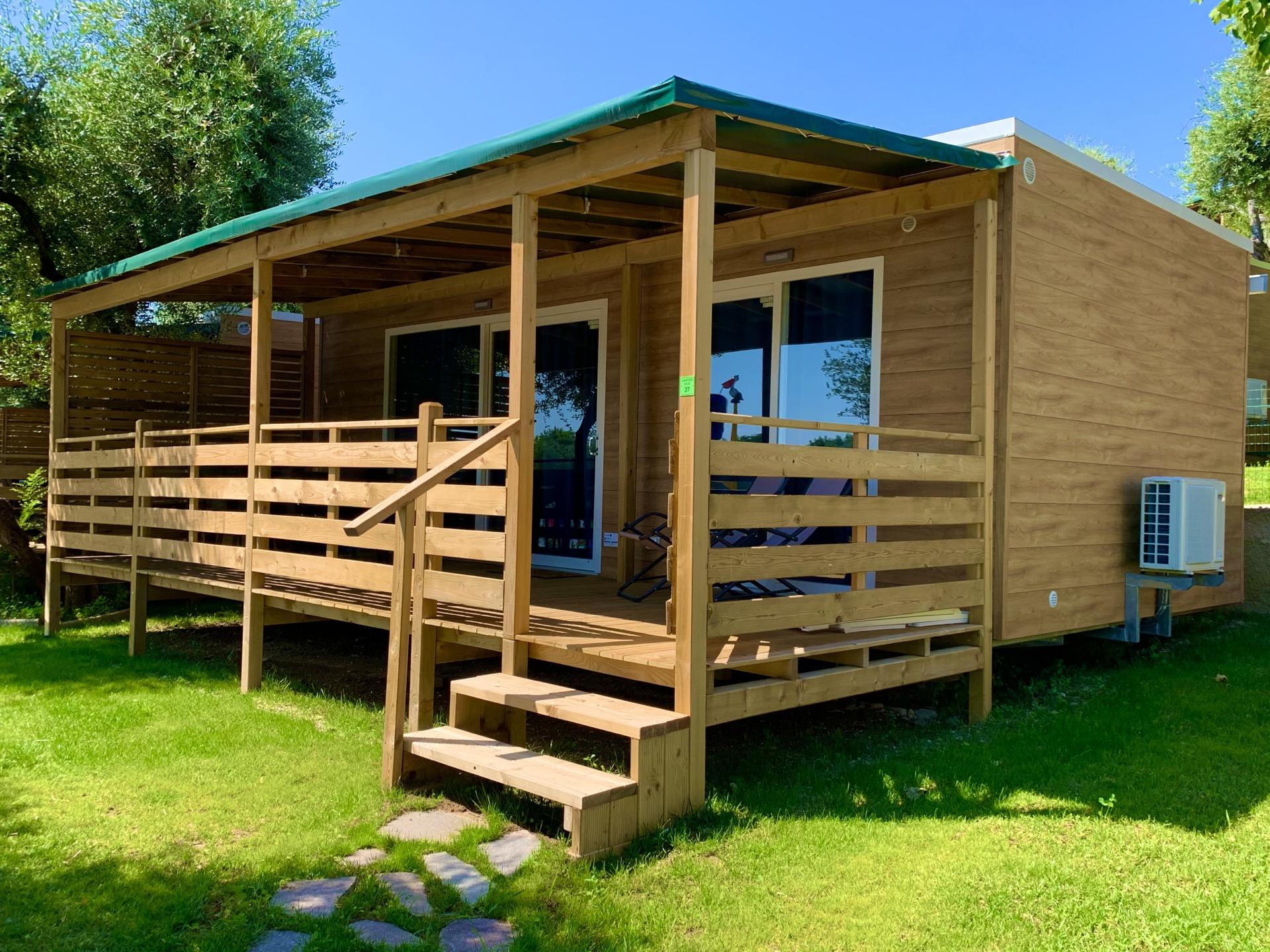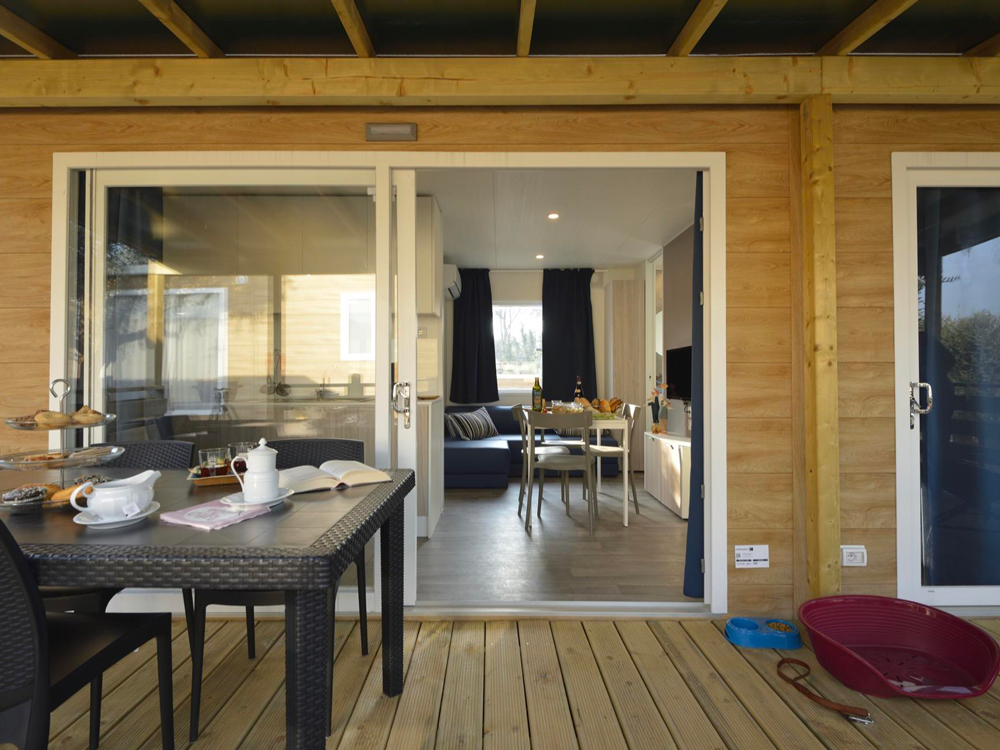 La casa mobile GARDEN DOG può ospitare fino a 5 persone. La casa mobile, con una superficie di 30 mq, offre spazi funzionali e confortevoli; la sistemazione dispone di soggiorno con aria condizionata, angolo cottura e divano, 1 camere da letto matrimoniale, 1 camera da letto con 3 letti singoli (di cui uno a bandiera) e 1 bagno con Wc, doccia e lavabo. All’esterno veranda coperta (7,4 x 2,5 m). In veranda è disponibile una cuccia per i vostri cani. Un posto auto incluso. Massimo 2 animali domestici ammessi.