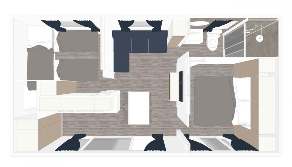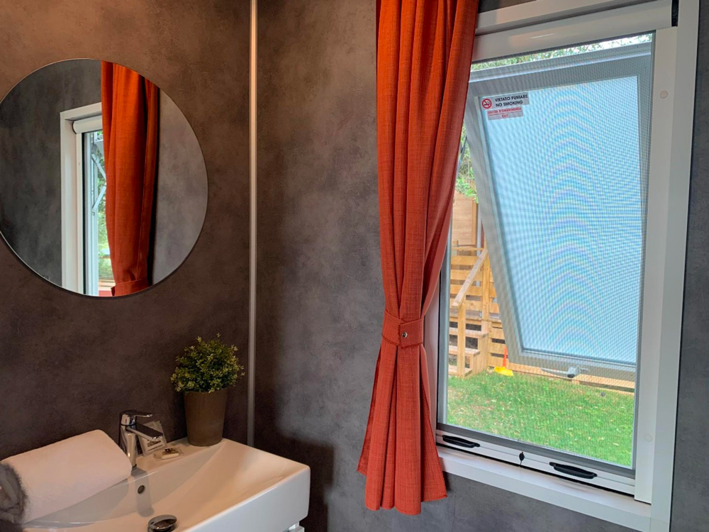 La casa mobile GARDEN SPA DOG può ospitare fino a 5 persone. La casa mobile, con una superficie di 30 mq, offre spazi funzionali e confortevoli; la sistemazione dispone di soggiorno con aria condizionata, angolo cottura e divano, 1 camere da letto matrimoniale, 1 camera da letto con 3 letti singoli (di cui uno a bandiera) e 1 bagno con Wc, doccia e lavabo. All’esterno veranda coperta (7,4 x 2,5 m) e chiusa con un cancelletto. Nel piccolo giardino è disponibile una Jacuzzi privata per piacevoli momenti di relax. Un posto auto incluso. Massimo 2 animali domestici ammessi.