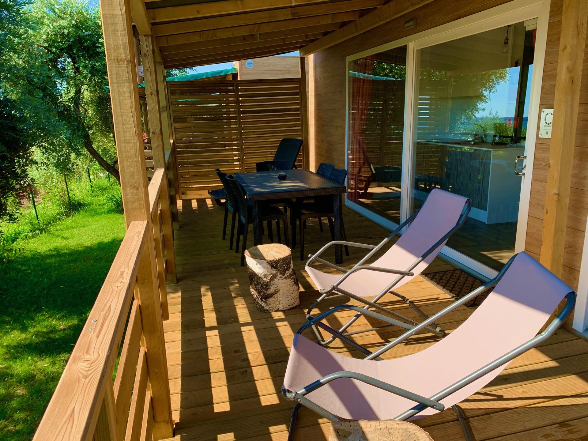La casa mobile TOP HILL DOG può ospitare fino a 5 persone. La casa mobile, con una superficie di 37 mq, offre spazi funzionali e confortevoli; la sistemazione dispone di soggiorno con aria condizionata, angolo cottura con piano a induzione e divano, 1 camere da letto matrimoniale, 1 camera da letto con 3 letti singoli (di cui uno a bandiera) e 2 bagni con Wc, doccia e lavabo. All’esterno veranda coperta con vista lago (8 x 2,5 m). Un posto auto incluso. Massimo 2 animali domestici ammessi.